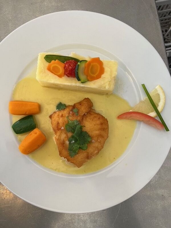 Dos de cabillaud laqué au miel à l'écraser de pommes de terre